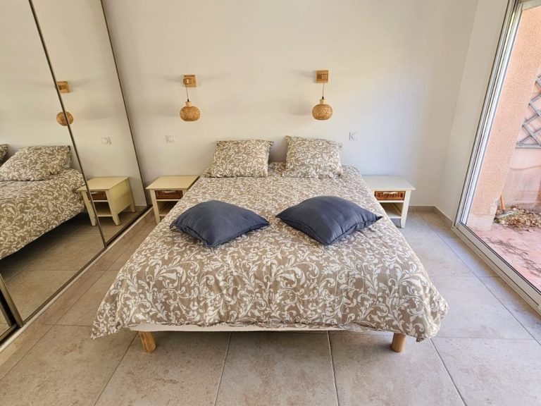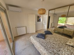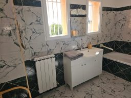 La chambre est au rez de chaussée et dispose d'une salle de bain, vue mer, privative avec une baignoire.